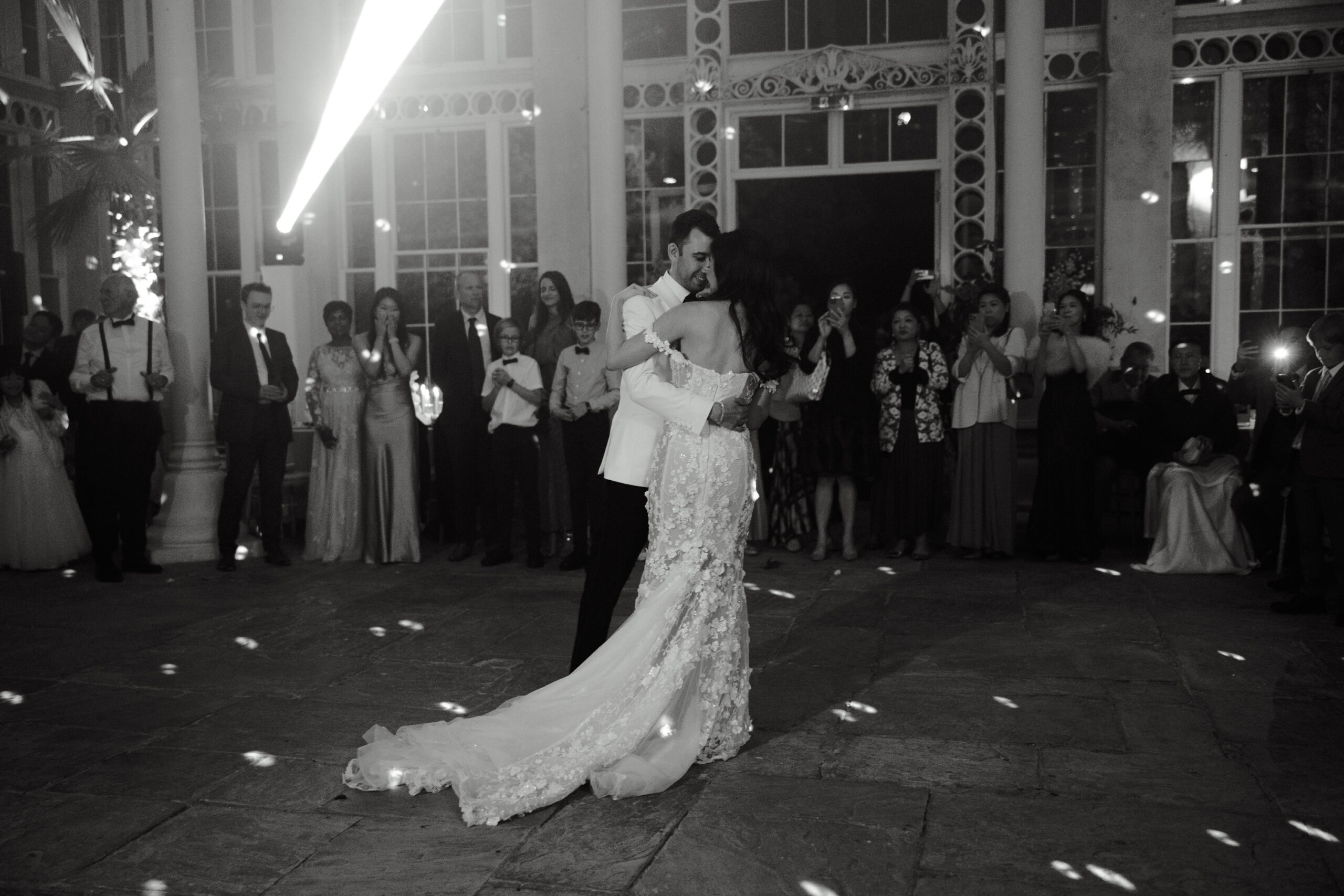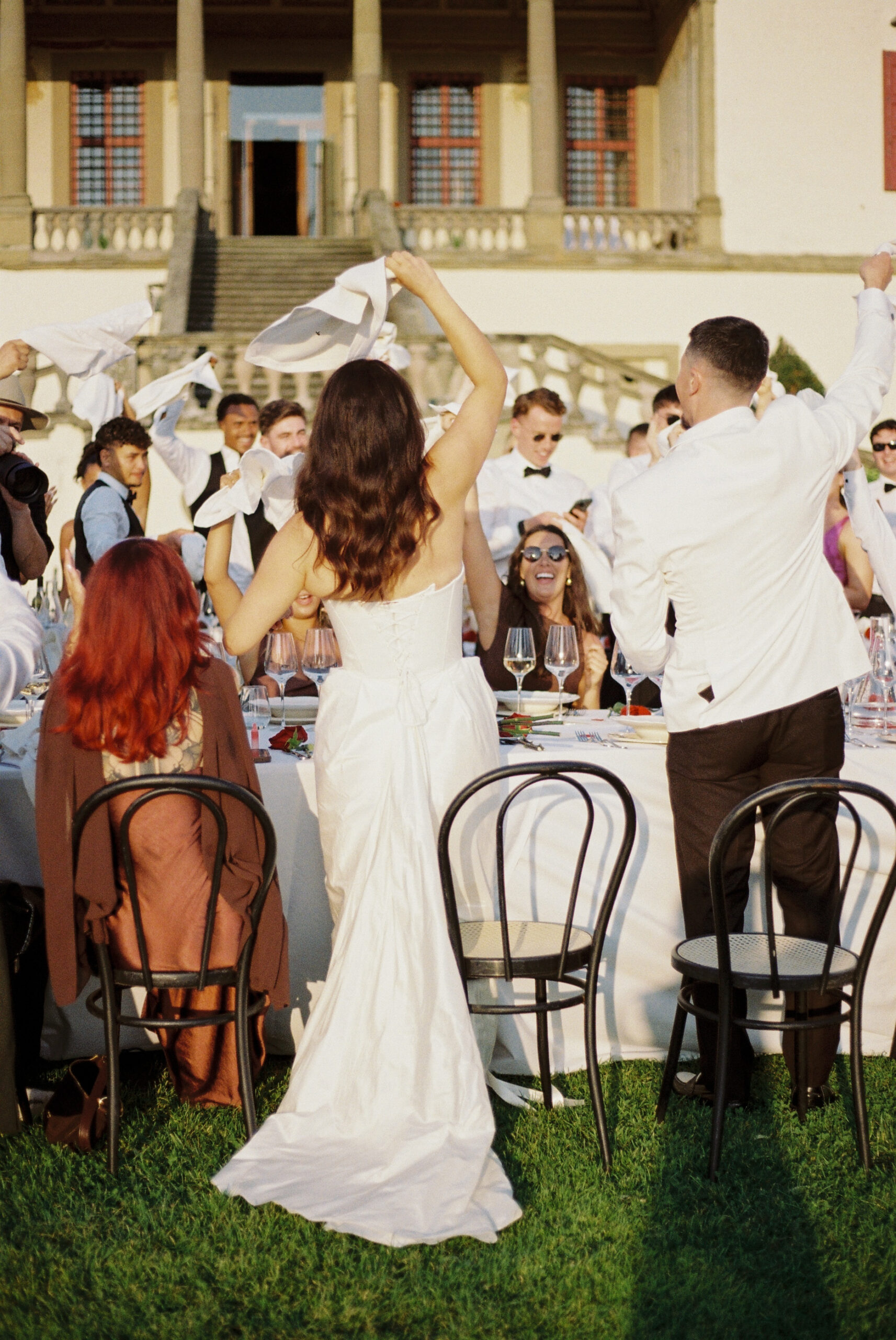 Guests moved from the church to an ethereal cocktail hour, savoring Italy’s finest wedding bites—creamy burrata, delicate cured hams, and refreshing Limoncello—while enjoying breathtaking views of the Tuscan hills and sunset. The celebration flowed into a minimal, chic wedding breakfast, with curvy, modern tables that gave the historic villa a fresh, stylish twist. As evening fell, the party came alive around a stunning tiramisu tower, capturing the effortless sophistication and romantic charm of a Tuscan destination wedding in Italy from golden hour to nightfall.