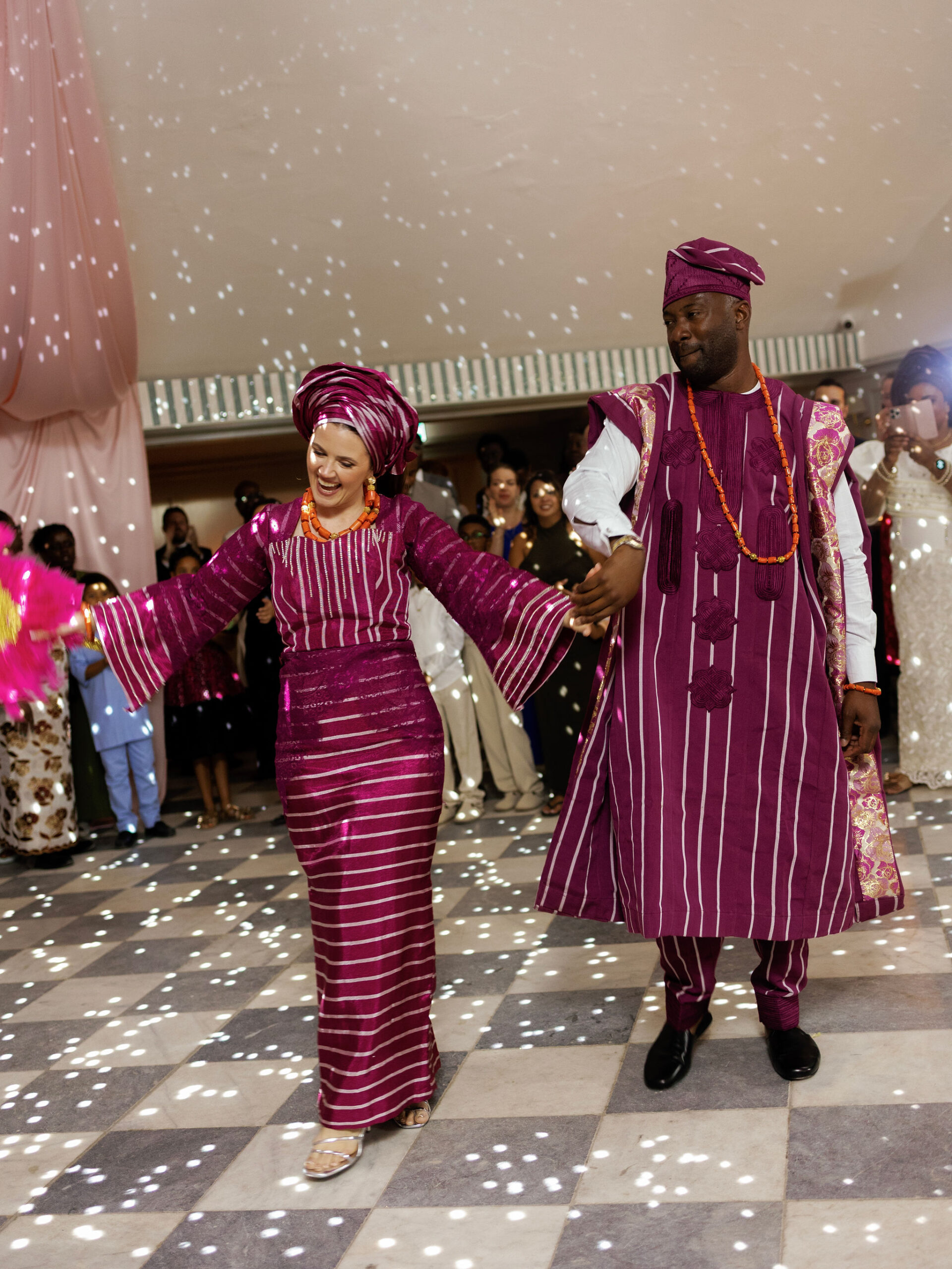 Later in the evening, the celebration shifted into a vibrant Nigerian-style party, with the couple and many guests changing into traditional outfits. The dance floor quickly filled with colour, music, and incredible energy, bringing this unforgettable multicultural wedding celebration in Wiltshire to a joyful close.