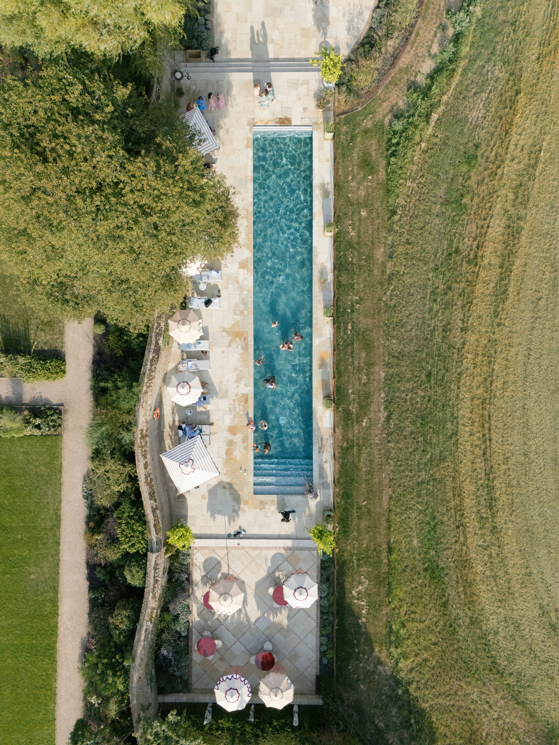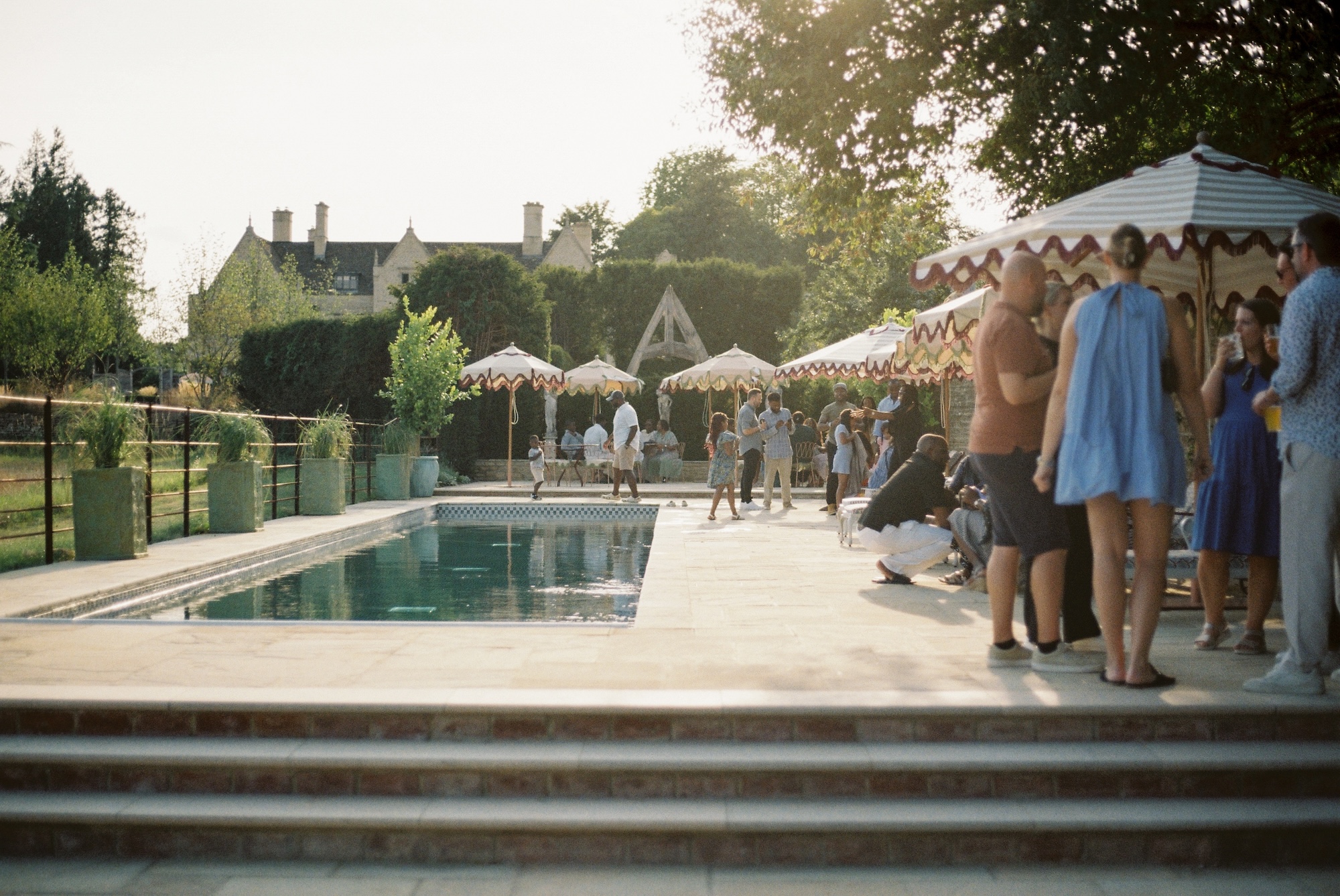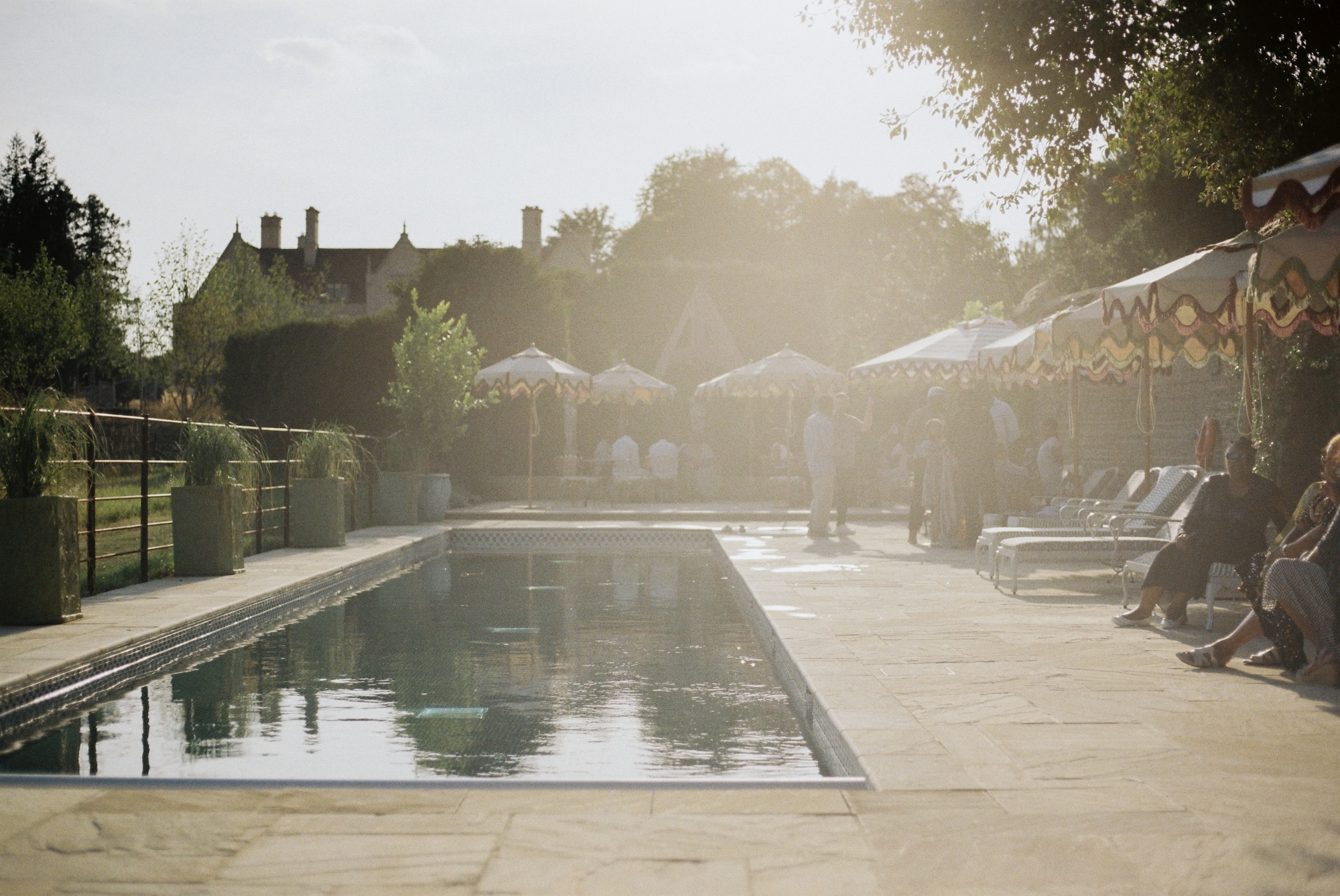 This two-day wedding at Kin House in Wiltshire was all about family, culture, and joyful celebration. The celebration began with a relaxed welcome pool party at Kin House’s new outdoor pool, where guests gathered in the sunshine, drinks in hand, easing into the festivities together. It felt less like a formal event and more like a summer weekend with loved ones in the English countryside.
